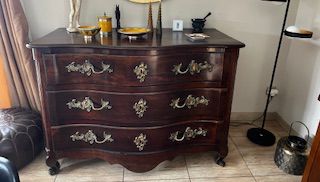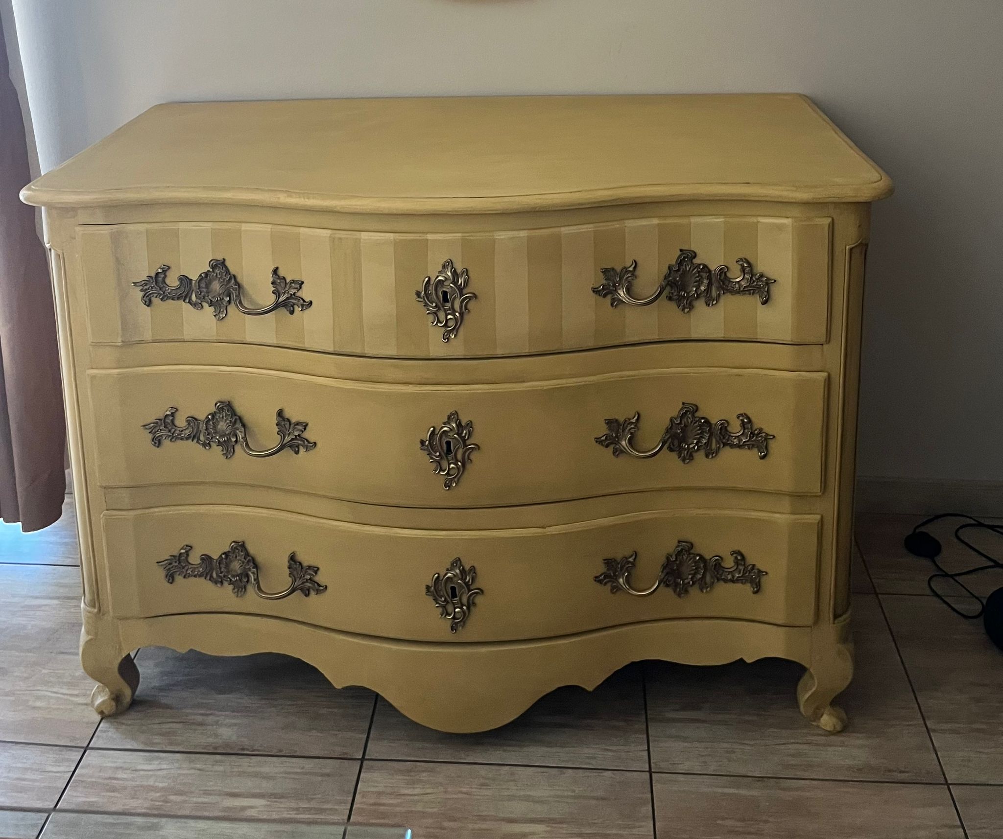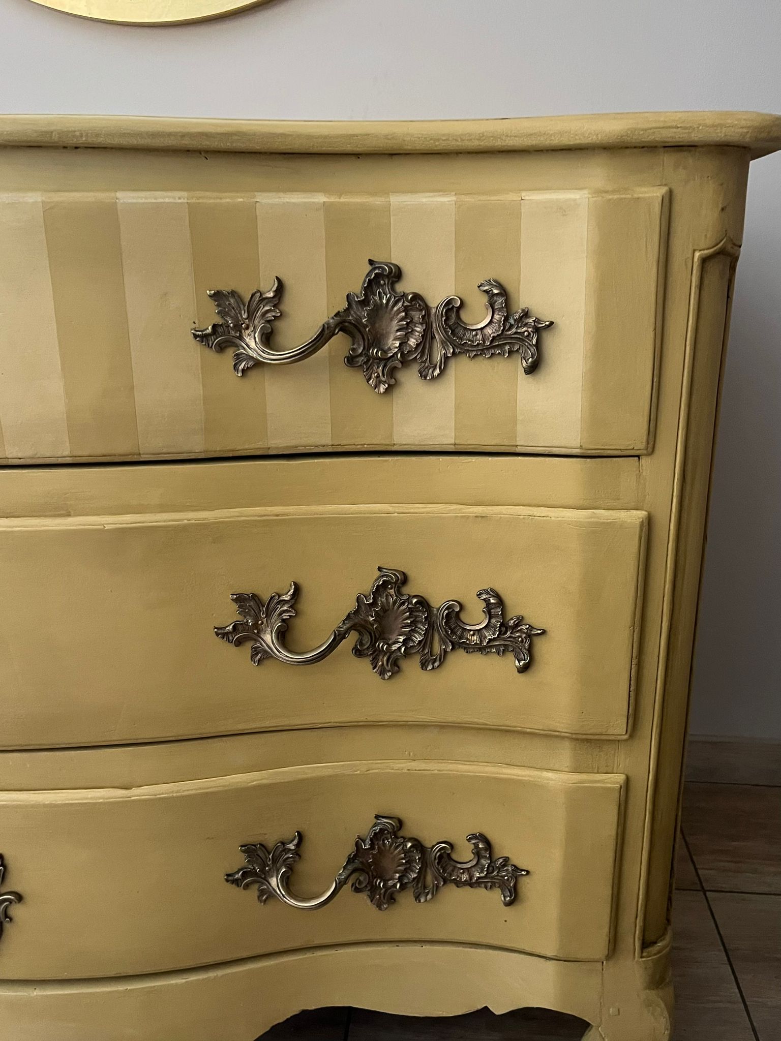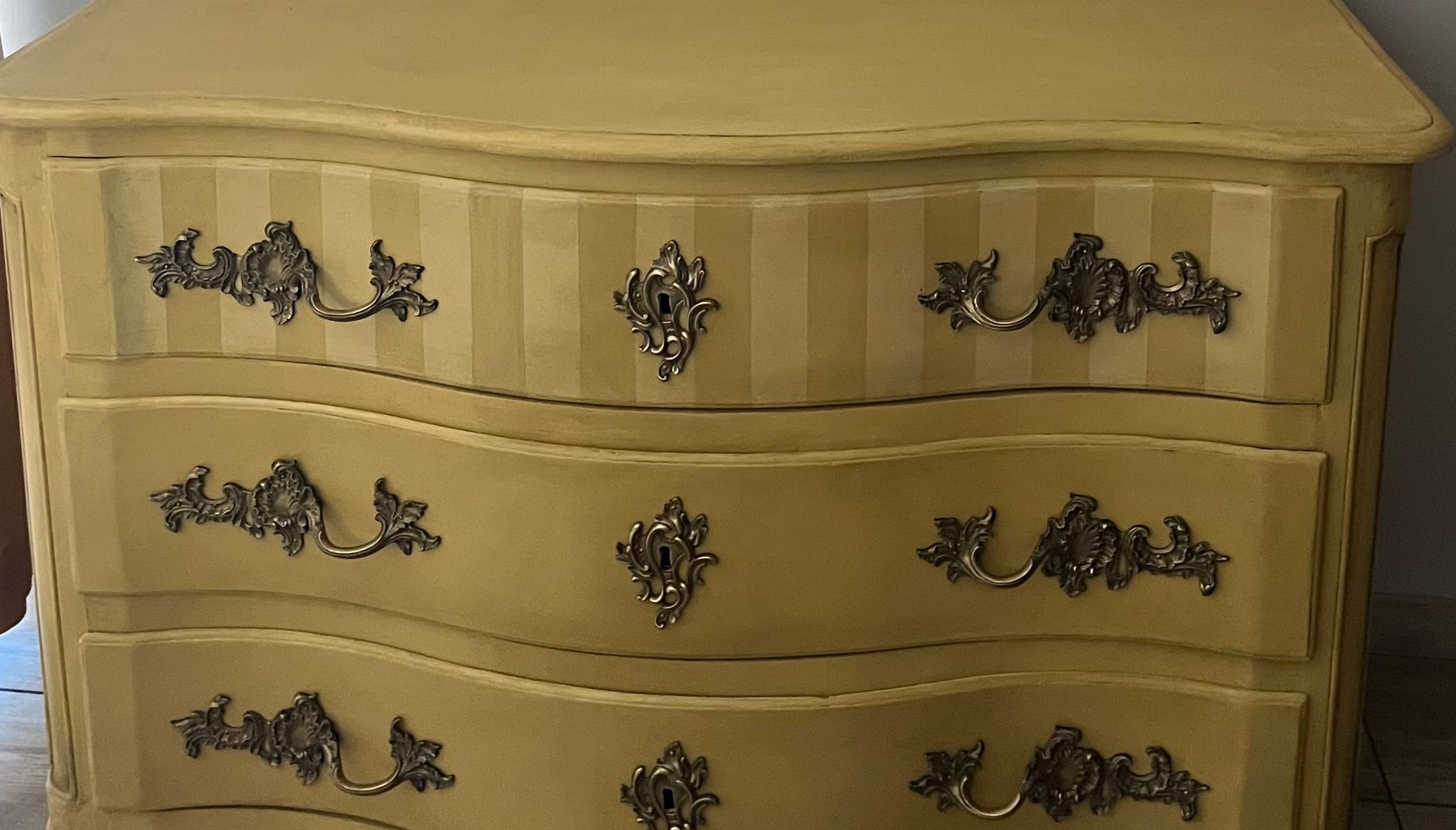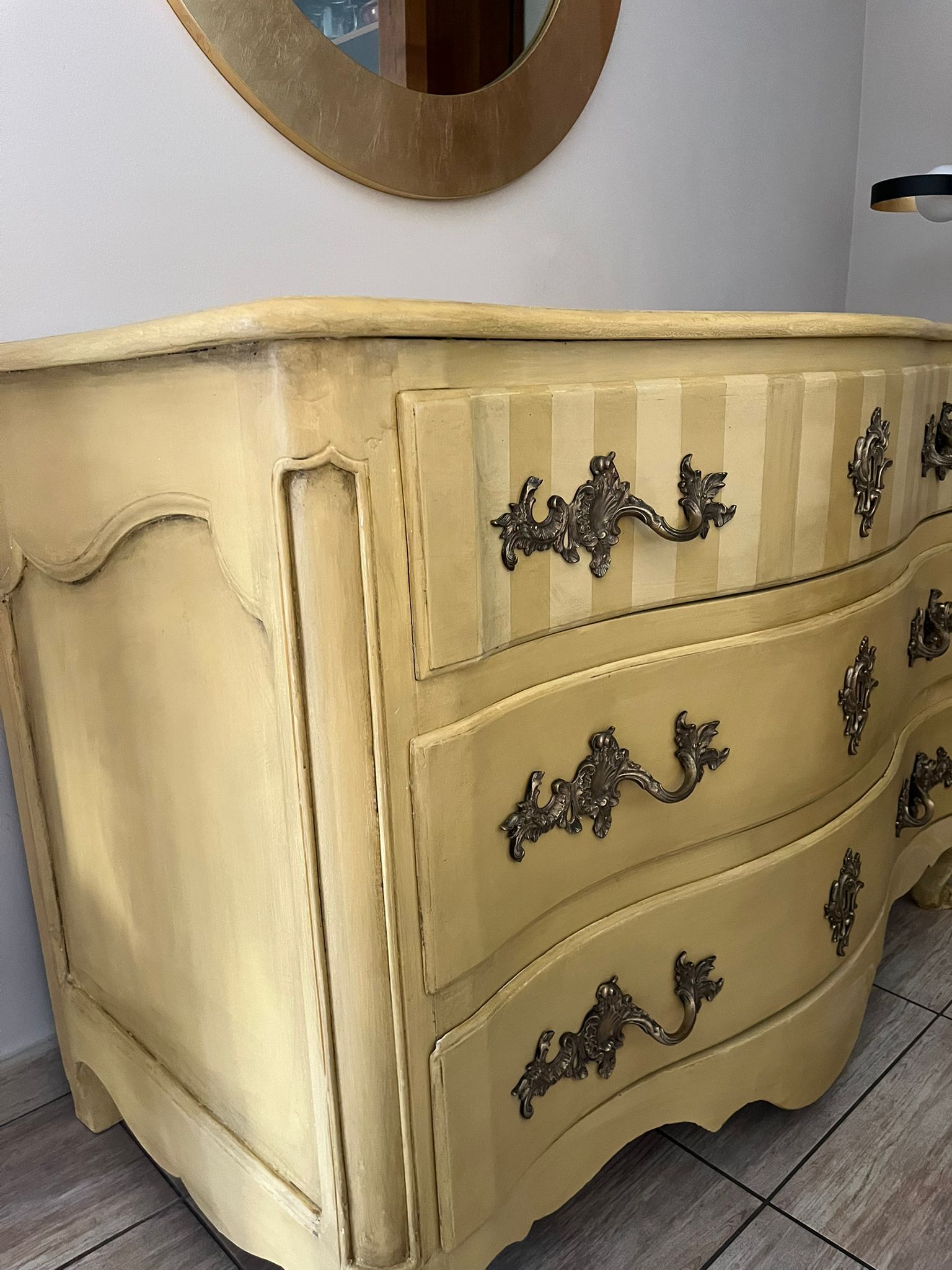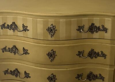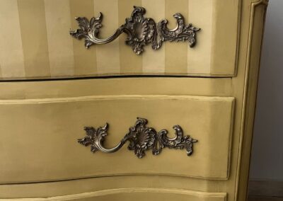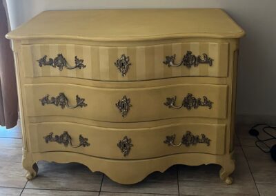 Relooking complet d’une commode ancienne de style Louis XV qui a été entièrement décapée et peinte ave une peinture naturelle de couleur ocre, patinée et sublimée par des rayures sur le premier tiroir.